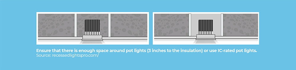 - Insulation challenge: the holes in the ceiling lead to energy loss. As a solution, use sealed pot lights or IC-rated lights (“insulation contact”). Spots that are not IC rated should be installed at least 3 inches away from any type of insulation.