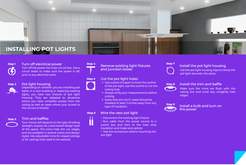 Pot lights, and LED pot lights in particular, are today’s ‘hot item’ when it comes to efficient and versatile lighting for new constructions and remodeling, in residential, commercial and industrial applications. We often get asked ‘How to change pot lights?’ and ‘How to install new pot lights?’, which is why we have produced this quick, practical guide that will guide you through pot light installation and choice considerations, for results that match your lighting needs and design style.