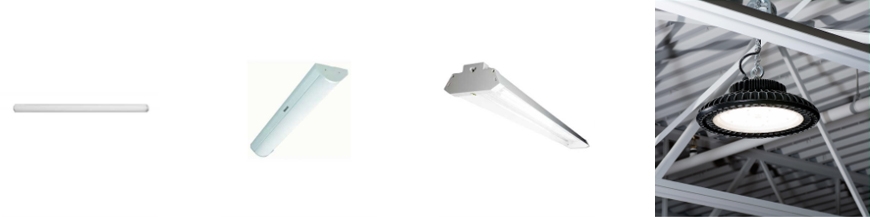 The lamp types used by garage fixtures include integrated LED arrays, LED tubes, fluorescent tubes, metal halide bulbs (MH), and sodium vapor lamps (HPS). You will also find retrofit LED lamps and kits, which are designed to upgrade older garage lights.