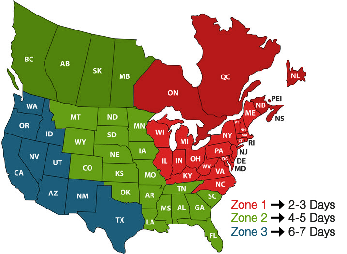We ship all across Canada and the Continental US. Shipping delays will vary all depending where the item is shipping to. Typical shipping delays for shipping door to door are listed below; these delays do not include order processing and consolidation which usually takes 1-2 business days.